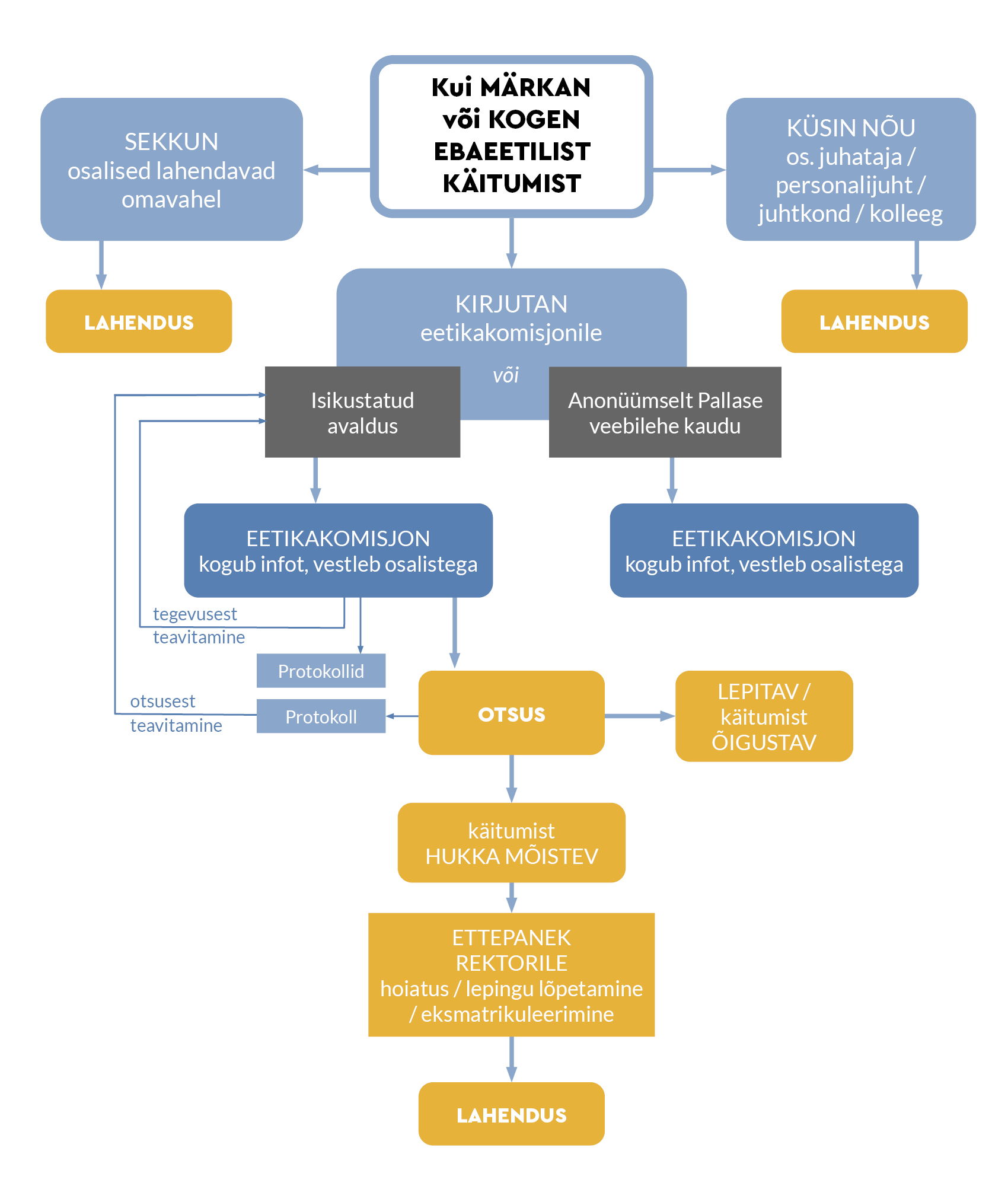Kaebuse esitamine eetikakomisjonile: Kui ka kolmanda osapoole kaasamisel probleemile lahendust ei leita, esita ametlik kaebus eetikakomisjonile kodulehel oleva vormi kaudu. Kaebus peab olema seotud Pallases toimunuga ning ei laiene eraelulistele konfliktidele.
