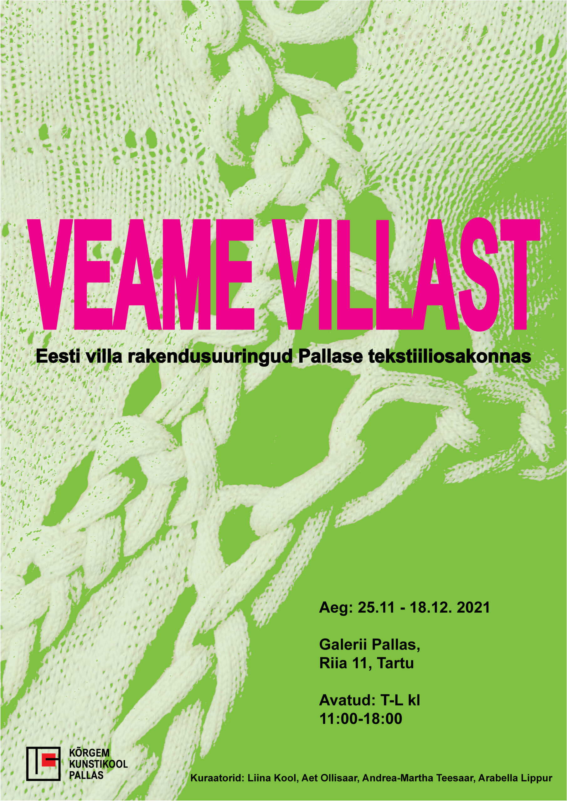 Näitus VEAME VILLAST võtab kokku Pallase tekstiiliosakonna rakendusuuringu tulemused. Alates 2017. aastast on tekstiiliosakond uurinud Eesti villa kasutamise võimalusi disaintoodete valmistamisel, välja on kujunenud kindlad partnerid nii Eesti lambakasvatajate kui villavabrikute hulgas. Rakendusuuringu eestvedaja tekstiiliosakonnas on olnud Liina Kool, läbi mitme aasta ja õppeaine on uuringusse kaasatud osakonna õppejõud ja üliõpilased. Tihedam koostöö projekti erinevates etappides on kujunenud Muru, Vaemla, Äksi ja TÜ Viljandi Kultuuriakadeemia villavabrikutega ning mitmete lambakasvatajatega. Esialgu üsna ettevaatlikust huvist kohaliku lõnga kasutamise vastu on saanud Pallase tekstiiliosakonnas teadlik trend.