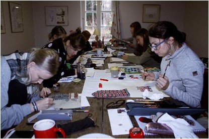 Neljanda kursuse tudengid veetsid 19.-21. oktoobril kolm päeva Heimtalis Anu Raua keskuses ja ERMi Heimtali Muuseumis koopiapraktikal. Juba pikaajaliseks traditsiooniks kujunenud praktikat juhendasid Aet Ollisaar ja Anu Raud. Juttu oli kõigest – väärtustest, Anu Raua keskuse tegemistest, ERMi Heimtali muuseumist, lahketest annetajatest ja talgulistest, koertest ja koerakarvadest kootud kinnastest, kahe Anu välja mõeldud mustriloomadest, aias ja põllul kasvavast toidust, Anu Raua juturaamatustest, uue raamatu käsikirjast ja vaiba kudumisest. Uue aja märk oli see, et autotäied tudengitega vurasid õhtuti Heimtalist Viljandisse ja Tartusse, aga oli ka kohapeal ööbijaid ja hommikul praktika alguseks olid kõik ilusti platsis. Ja tuleb tunnistada, et tudengid töötasid põhjalikult ja järjepidevalt ning joonised jõudsid nende päevadega päris kaugele. Ja oi kui maitsvad olid kohaliku toitlustaja lõunasupid! Minu jaoks on muidugi nendel praktikatel alati lisaväärtus – õhtused jutuajamised ja hommikusöögid Anuga. See on juba mitmel aastal olnud hea võimalus teha uusi plaane ja meenutada vanu aegu Käärikul tudengiaastatest tänaseni välja.